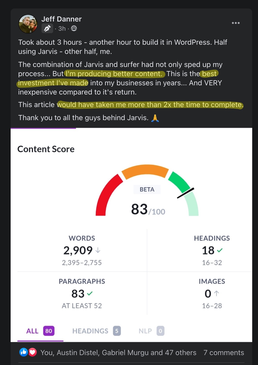 - Using Surfer guidelines with content written by Jarvis (your AI writing assistant)